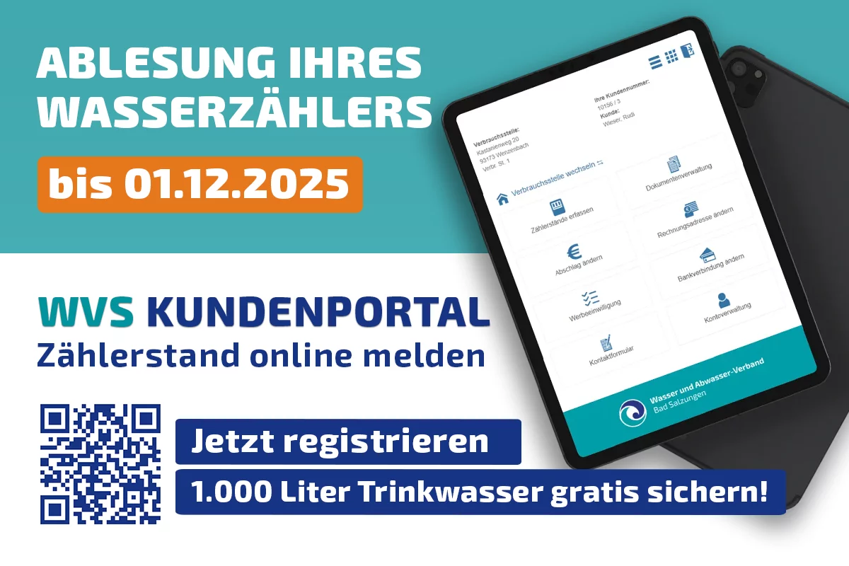 Melden Sie uns Ihren Zählerstand im WVS Kundenportal und sichern Sie sich 1.000 Liter Trinkwasser gratis in der nächsten Verbrauchsabrechnung.